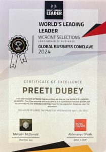 In a momentous recognition of leadership and innovation, our founder and CEO, Preeti Dubey, has been honored with the prestigious “Leader of the Year – World’s Leading Leader 2024” award at the WCRCINT Global Business Conclave and Awards. The distinguished ceremony, held at the historic UK Parliament’s House of Lords in the Palace of Westminster, celebrated exceptional global leadership and transformative business vision.